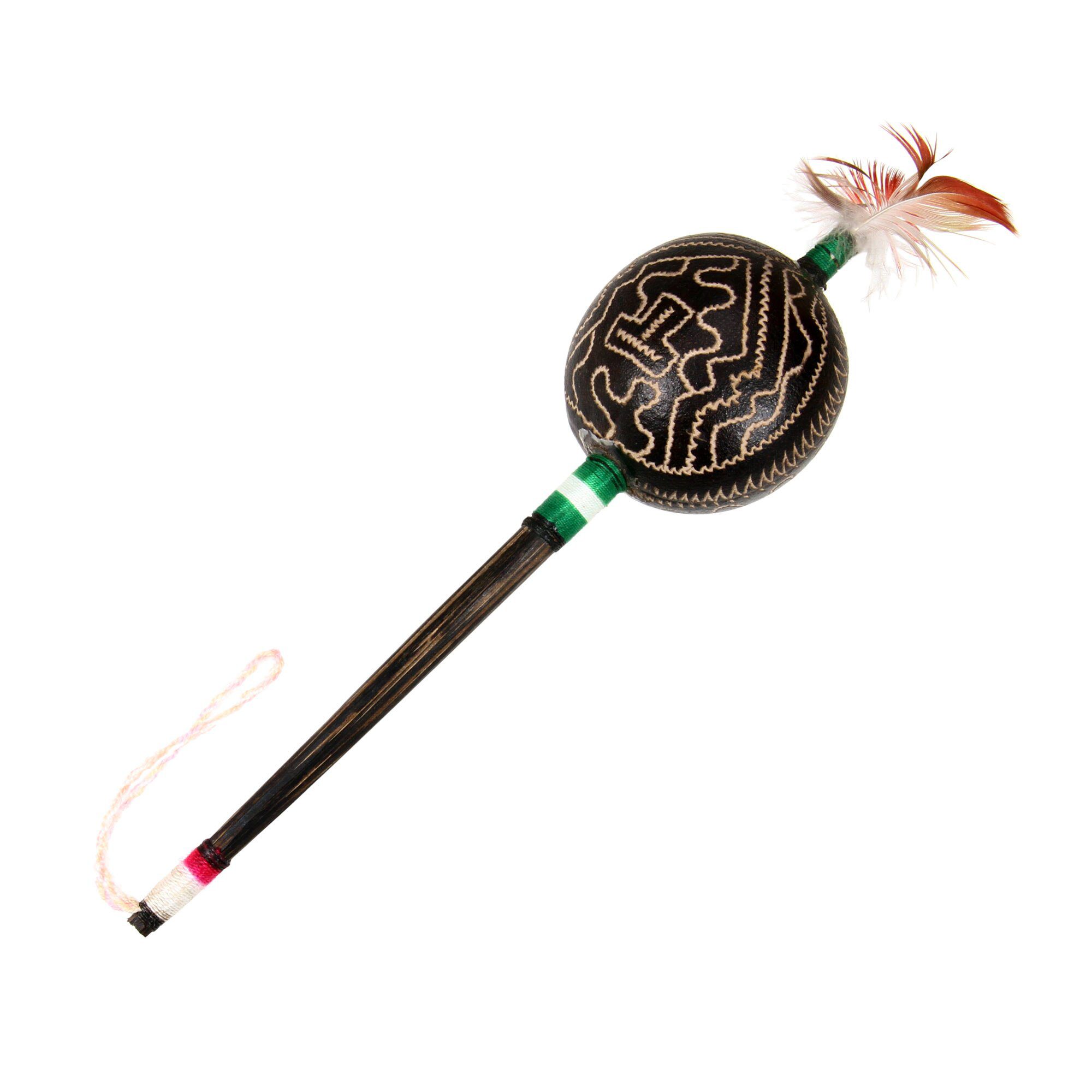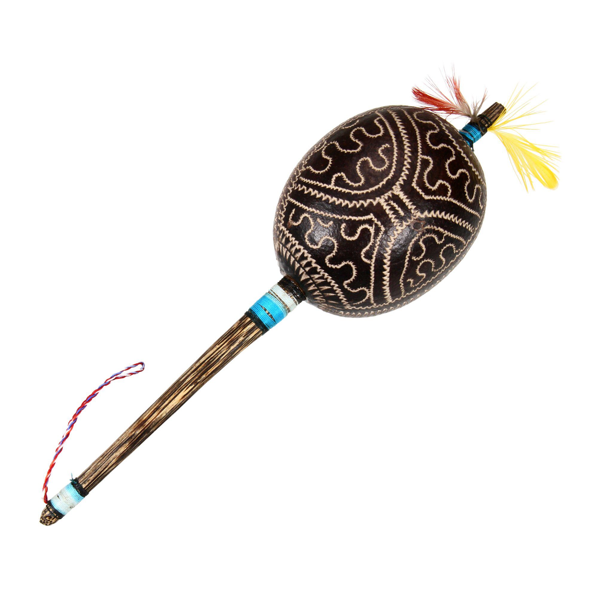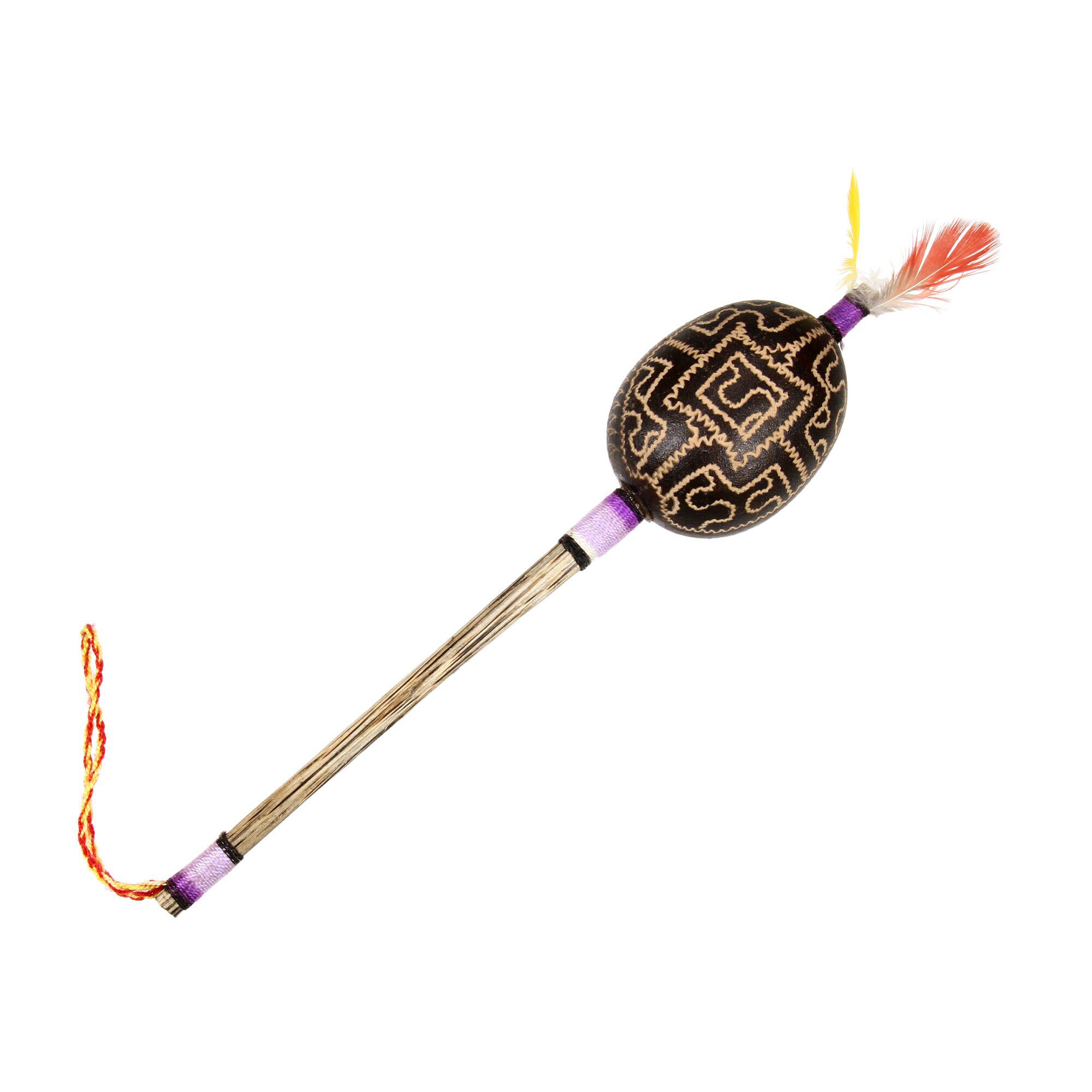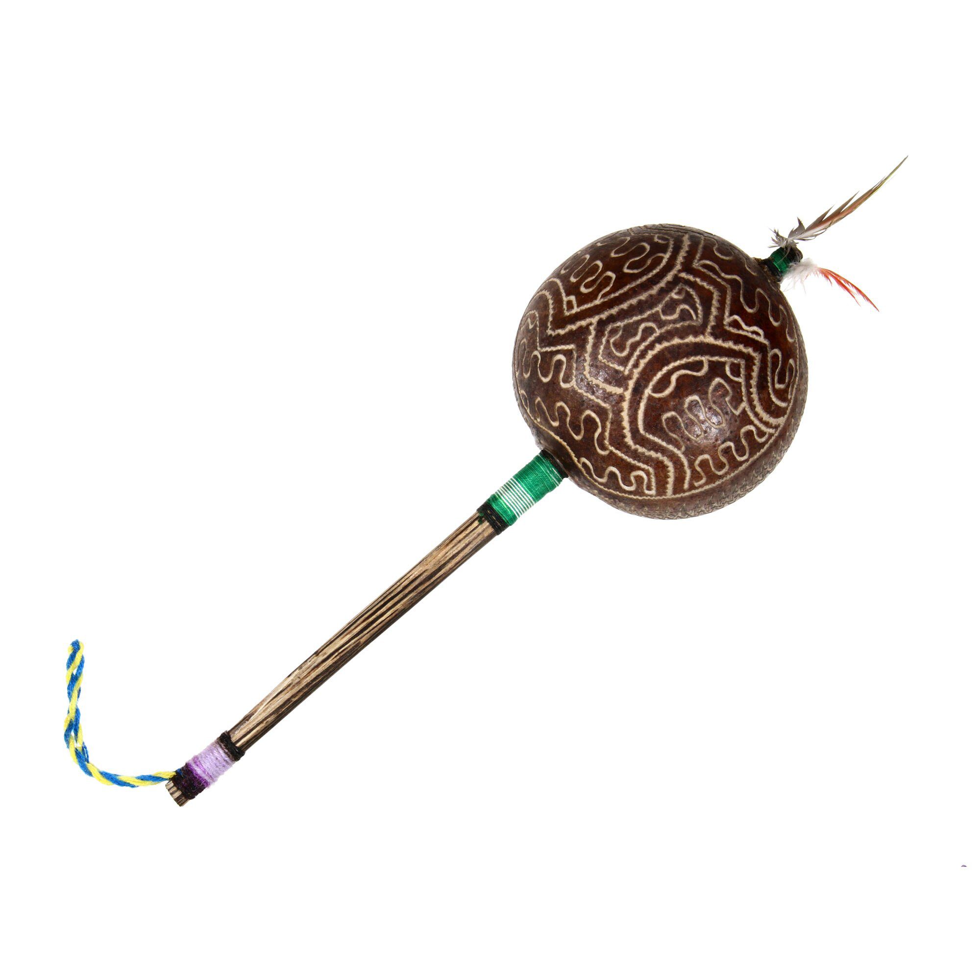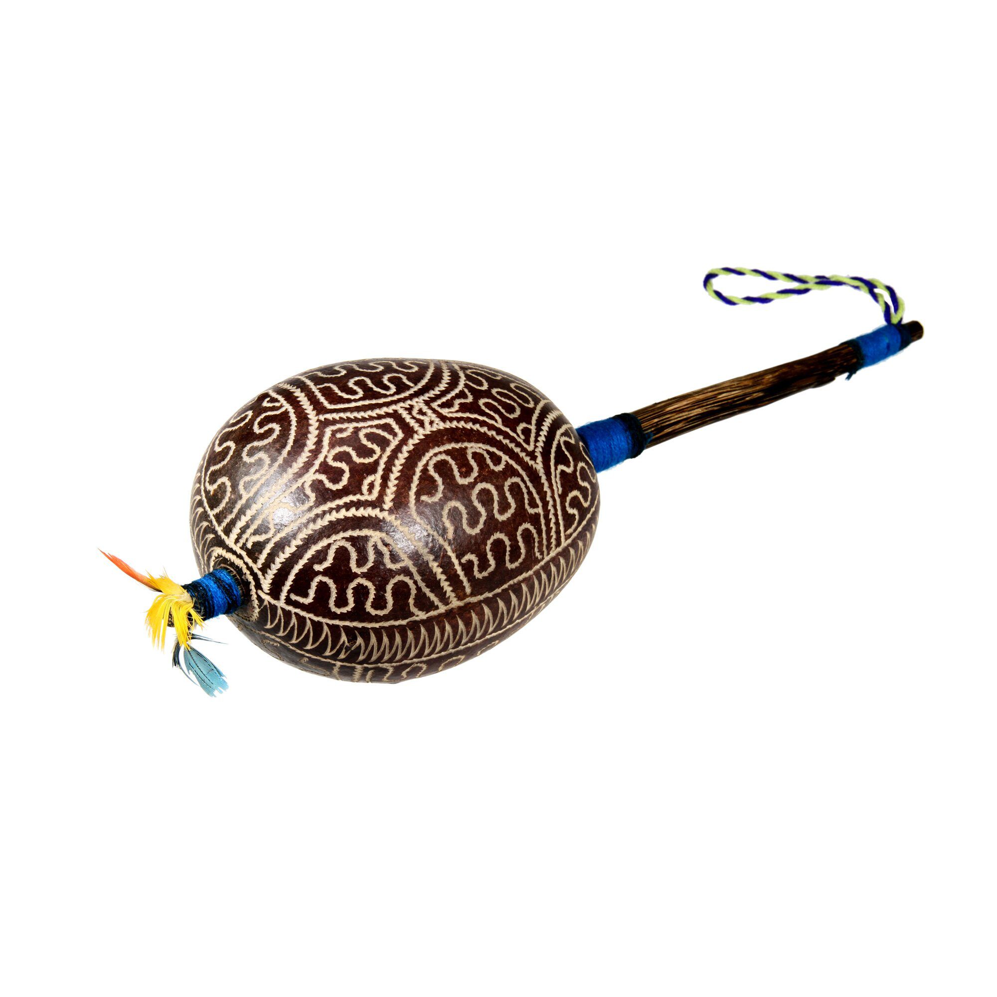 Mūsų Shipibo šamano barškutį gamina Shipibo-Conibo tautos moterys Peru Amazonės žemumose. Skambantis korpusas pagamintas iš vadinamojo tutuma kalabasmedžio vaisiaus ir papuoštas dvasiniais ornamentais.