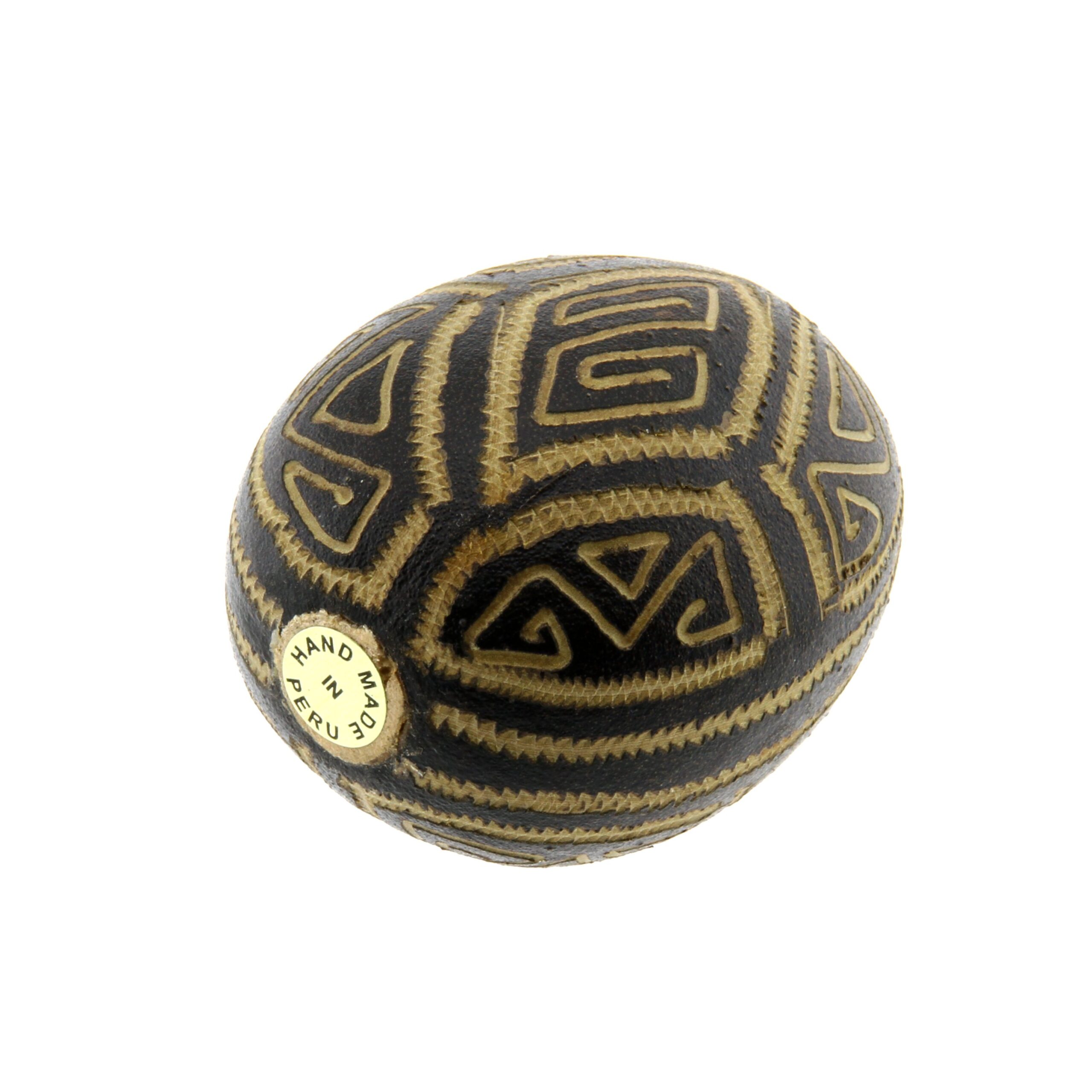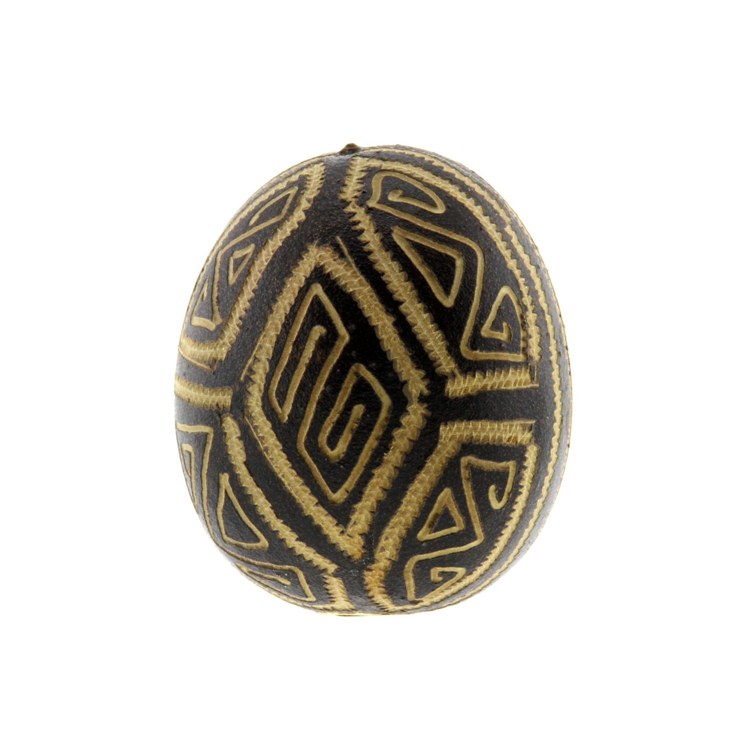 Šviesus abstraktus raštaas ant tamsiai rudo kiaušinio formos marako traukia dėmesį. Jis kruopščiai gaminamas rankomis – moliūgas išdžiovinamas, deginama, o tada puošiamas ornamentais. Todėl kiekvienas marakas yra unikalus!