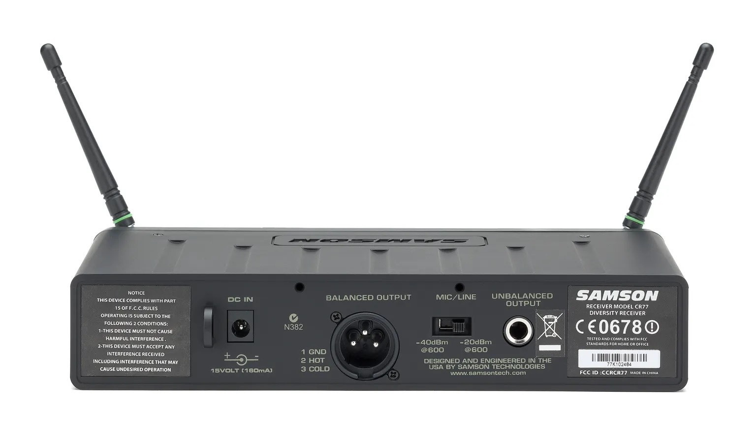 CR77 True Diversity imtuvas užtikrina patikimą veikimą su iki 300′ (90m) belaidžio ryšio diapazonu. Jo pusiau rack tipo korpusas yra pakankamai lengvas, kad galėtumėte jį įsidėti į savo krepšį. Galinėje panelėje yra subalansuoti XLR ir nesubalansuoti 1/4″ išėjimai, leidžiantys lanksčias prijungimo galimybes.